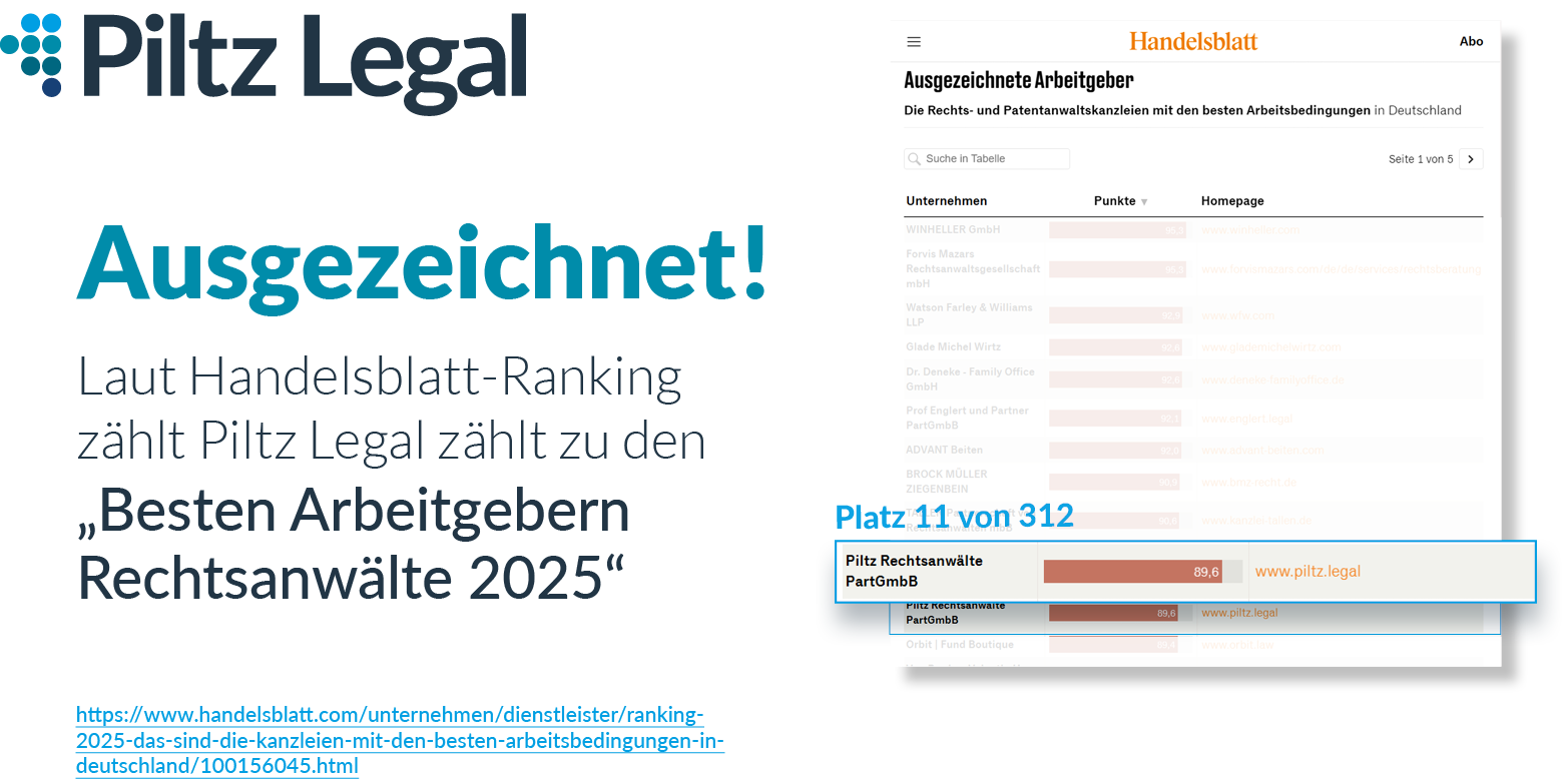 Wir freuen uns sehr, in diesem Ranking Platz 11 von über 300 teilnehmenden Kanzleien erreicht zu haben und dafür vom Handelsblatt mit dem Siegel „Beste Arbeitgeber“ ausgezeichnet worden zu sein. Diese Auszeichnung bestätigt unseren Anspruch, ein Arbeitsumfeld zu schaffen, in dem sich alle Kolleginnen und Kollegen wohlfühlen und ihre Stärken entfalten können.